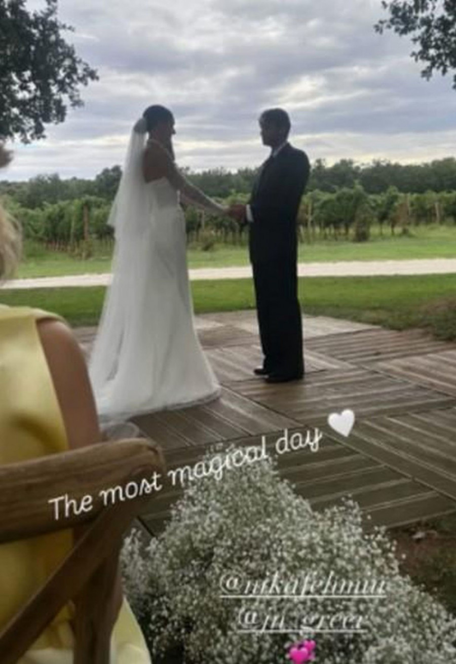 Nika je zasenila sve svojom pojavom. Izabrala je elegantnu venčanicu koja je isticala njenu prirodnu lepotu, dok je kosu vezala u jednostavnu i sofisticiranu frizuru. Mladoženja se odlučio za sivu kombinaciju, u kojoj je izgledao otmeno i moderno.