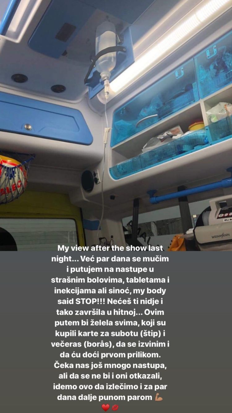 - Već par dana se mučim i putujem na nastupe u strašnim bolovima, tabletama i injekcijama, ali sinoć je moje telo reklo stop! Nećeš niđe i tako završila u Hitnoj. Ovim putem bih želela svima koji su kupili karte da se izvinim, doći ću prvom prilikom. Čeka nas mnogo nastupa, ali da se ne bi i oni otkazali, idemo da ovo izlečimo i za par dana dalje punom parom - poručila je Senidah na Instagramu.