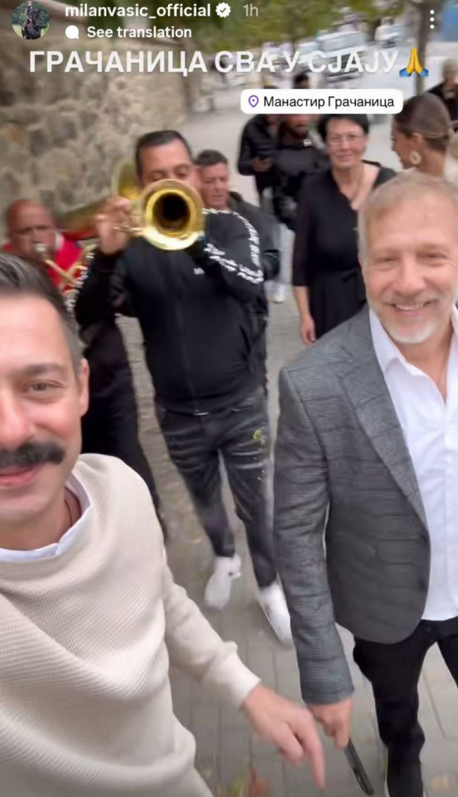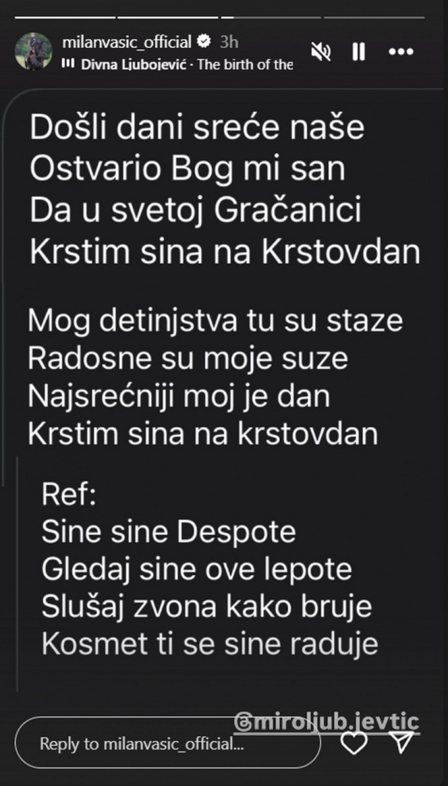 "Došli dani sreće naše, ostvario Bog mi san. Da u svetoj Gračanici krstim sina na Krstovdan. Mog detinjstva tu su staze, radosne su moje suze. Najsrećniji moj je dan, krstim sina na Krstovdan. Sine, sine, Despote, gledaj sine ove lepote. Slušaj zvona kako bruje, Kosmet ti se sine raduje", stoji u objavi koju je podelio Milan Vasić.