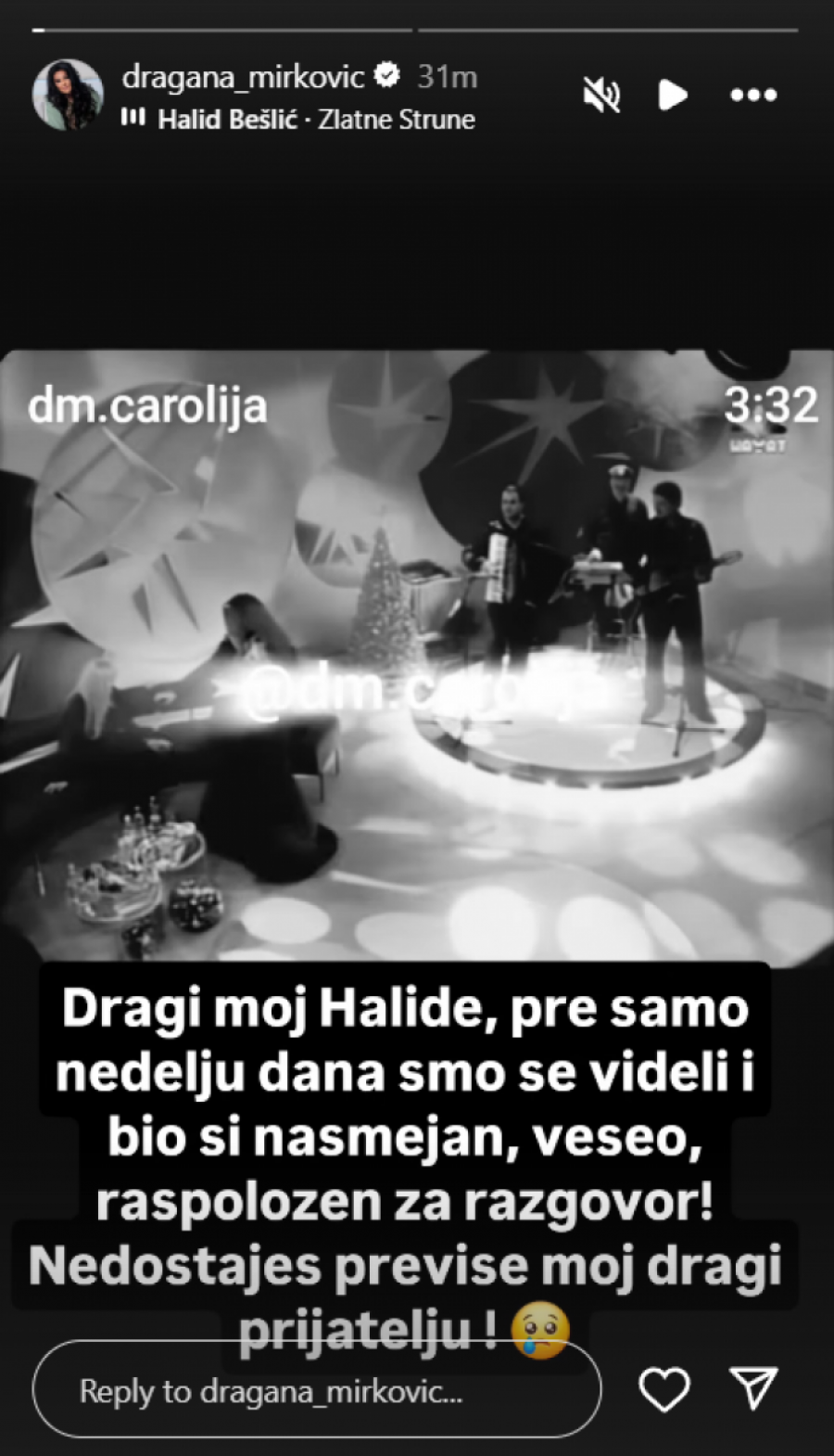 Dragana Mirković o Halidu Bešliću maločas je progovorila na Instagramu ističući da su se poslednji put videli prethodne nedelje i da ništa nije ukazivalo na ovako tužan i tragičan kraj:
