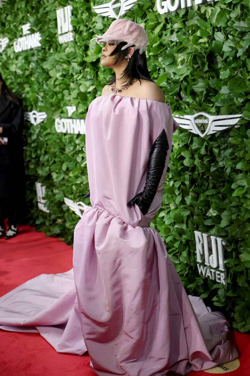 Sa druge strane Rijana, koja se nedavno porodila treći put, pojavila se u ne baš sjajnoj haljini. Kraljica crvenog tepiha svratila je u avangardnoj ružičastoj haljini sa preuveličanim gornjim delom i suknjom, sa dugim šlepom koji se spuštao iza nje. Na dodeli Gotam filmskih nagrada, zajedno sa svojim suprugom, Rijana je prošetala crvenim tepihom u nekoj bizarnoj ružičastoj čaršav haljini, sa crnim kožnim rukavima i još bizarnijim šeširom ukrašenim perjem. Takođe je imala izrez koji je padao na ramena, kao i spušten struk. Rijana je uparila izgled sa dugim crnim rukavicama i ružičastom maramom za glavu u istoj boji kao i njena haljina.