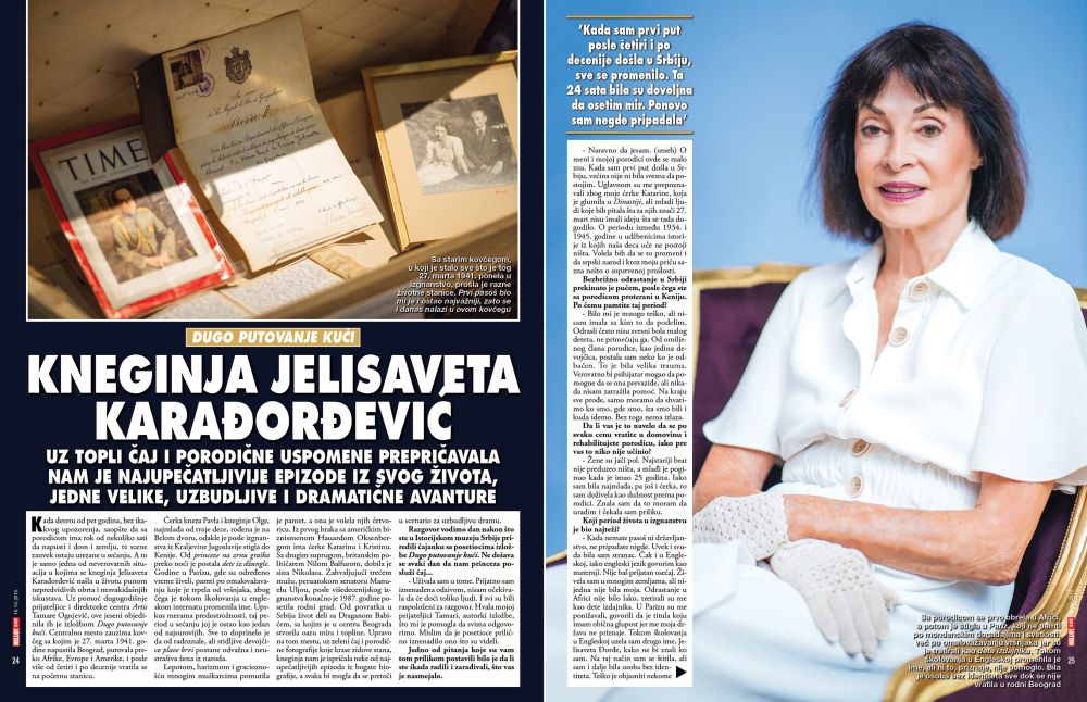 - Kada nemate pasoš ni državljanstvo, ne pripadate nigde. Uvek i svuda bila sam stranac. Čak i u Engleskoj, iako engleski jezik govorim kao maternji. Nije baš prijatan osećaj. Živela sam u mnogim zemljama, ali nijedna nije bila moja. Odrastanje u Africi nije bilo lako, tretirali su me kao dete izdajnika. U Parizu su me ponižavali, govorili da je titula koju imam obična glupost jer me moja država ne priznaje. Tokom školovanja u Engleskoj uzela sam drugo ime, Jelisaveta Đorđe, kako ne bi znali ko sam. Na taj način sam se štitila, ali sam i dalje bila osoba bez identiteta. Teško je objasniti nekome ko to nije doživeo... Osećaj nepripadanja je strašan. Kada sam sa suprugom, peruanskim senatorom Manuelom Elijasom uspela da na 24 časa dođem u Srbiju, sve se promenilo. Bilo je kratko, ali dovoljno da osetim mir. Ponovo sam negde pripadala.