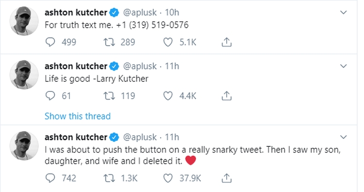 Kučer je napisao tvit koji se svima na prvi pogled učinio kao reakcija na optužbe bivše supruge za varanje i navode o seksu u troje. Glumac je prvo napisao da je hteo da objavi neprijatan tvit, ali kada se osvrnuo i video svog sina, ćerku i suprugu, obrisao je napisano dodavši: "Život je dobar - Lari Kučer", citiravši svog oca.