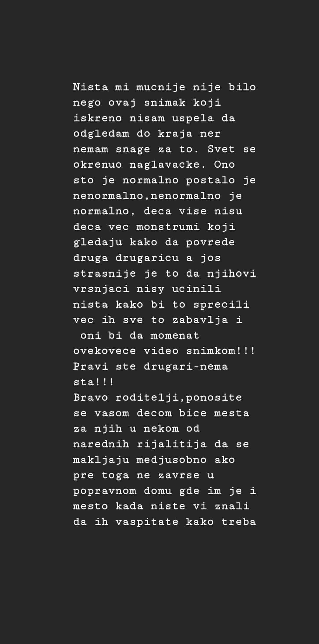 - Svet se okrenuo naglavačke, deca više nisu deca, već monstrumi koji gledaju kako da povrede drugaricu, a još strašnije je što njihovi vršnjaci nisu uradili ništa da bi to sprečili. Bravo, roditelji, ponosite se svojom decom, biće mesta za njih u nekom od narednih rijalitija, da se makljaju međusobno, ako pre toga ne završe u nekom popravnom domu - vrlo oštro i jasno je poručila Katarina.