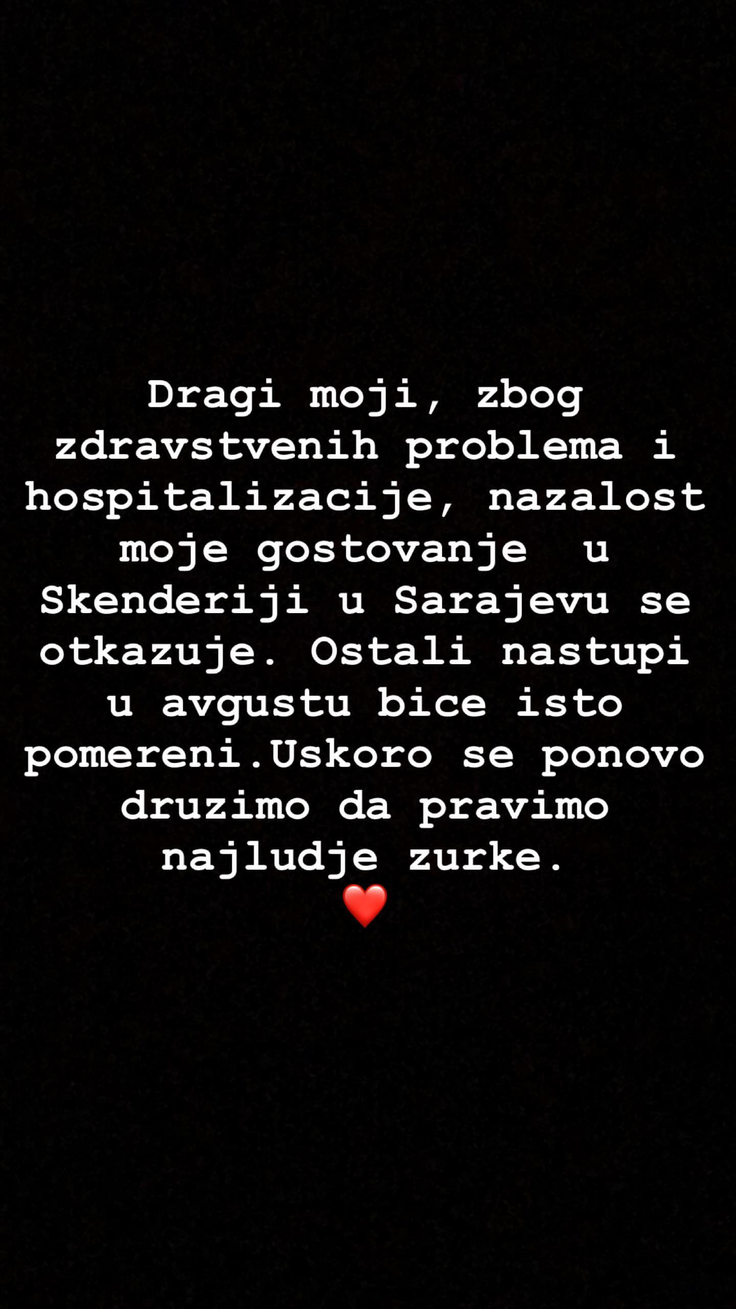 Katarina nije navela o čemu se radi, ali je jasno poručila da se nalazi u bolnici i da zbog svog narušenog zdravstvenog stanja otkazuje nastup u Sarajevu, ali i sve zakazane nastupe u avgustu.