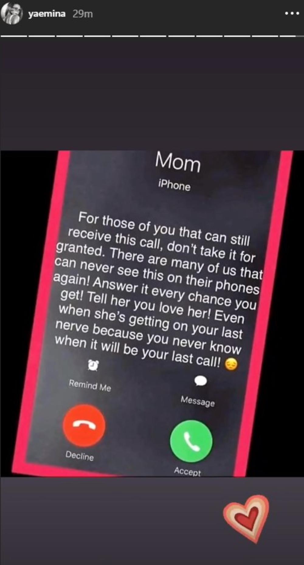 - Za sve vas koji i dalje možete da primite ovaj poziv, ne uzmajte ga zdravo za gotovo. Postoji mnogo nas koji više ne možemo da vidimo ovo na našim telefonima! Javi se kad god imaš priliku! Reci joj da je voliš! Čak i kada vam ide na poslednji živac, jer nikada ne znate kada će to biti vaš poslednji razgovor - napisala je Emina.