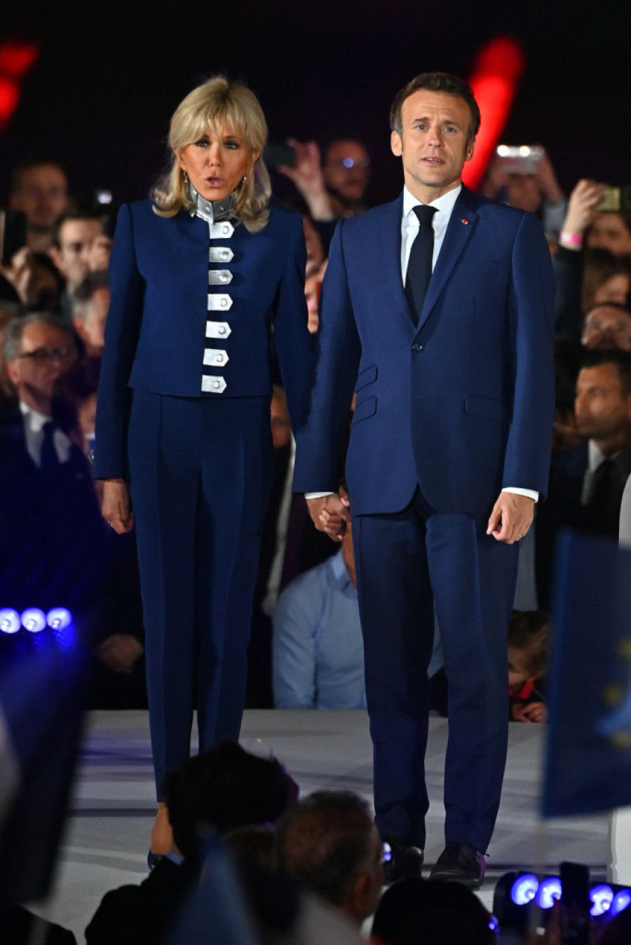 I za ovu priliku otmena Brižit izabrala je autfit o kom će se dugo pričati. Dominirala je tamnoplava, jedna od boja na francuskoj zastavi (prema jednoj verziji predstavlja prvo francusko kraljevstvo, dok prema drugoj sa crvenom i belom simboliše moto „sloboda, jednakost, bratstvo“). Umesto klasičnih revera, na kratkom blejzeru videli smo detalje u military stilu i srebrnu kragnu, a u ovom sjajnom izdanju malu, ali efektnu ulogu imale su i minđuše. Šta reći, osim – svaka čast, madam Makron!