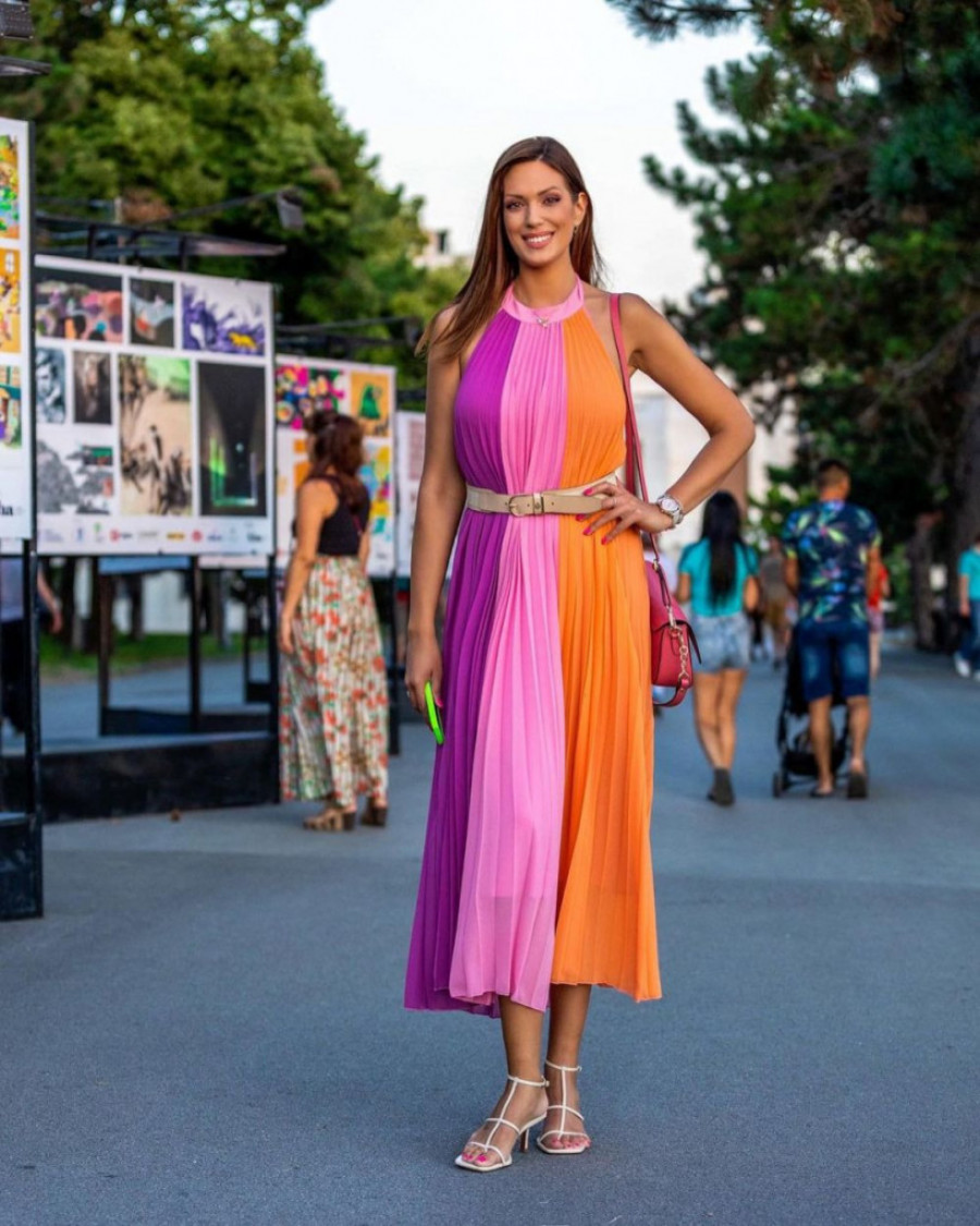 Letnja haljina u narandžastim, pink i ljubičastim tonovima idealna je za svaku priliku, što je pokazala i voditeljka Nina Radulović kada se u identičnoj kreaciji italijanskog brenda pojavila na nedavno održanom Međunarodnom festivalu ilustracije u Beogradu.