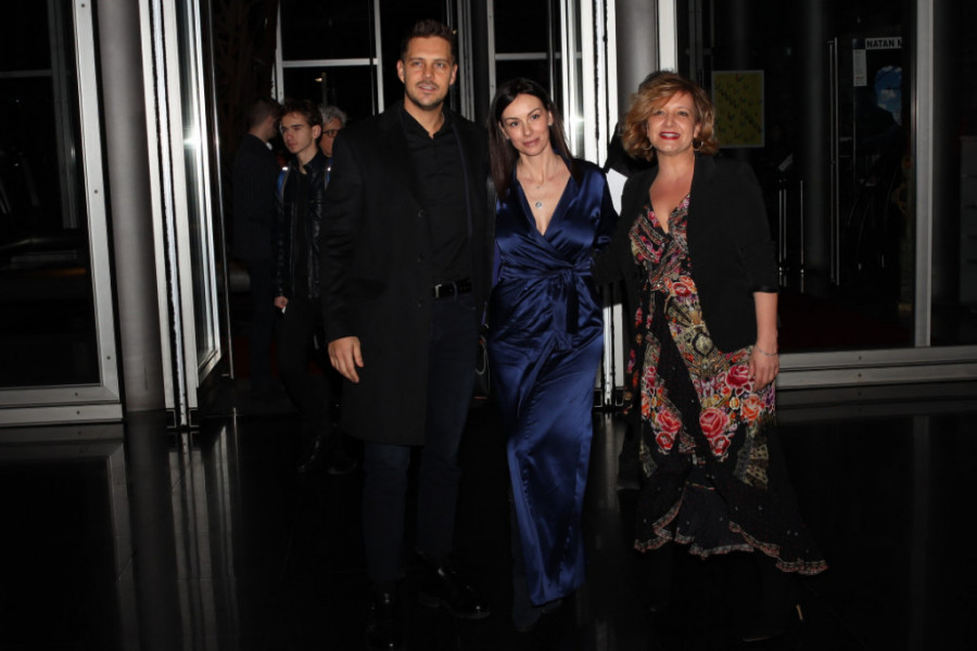 Proslavljena glumica nosila je dugu satensku haljinu na preklop u kraljevskoplavoj boji i nasmejana pozirala sa kolegom Milošem Bikovićem i Tamarom Vučković Manojlović, direktorkom Jugoslovenskog dramskog pozorišta.