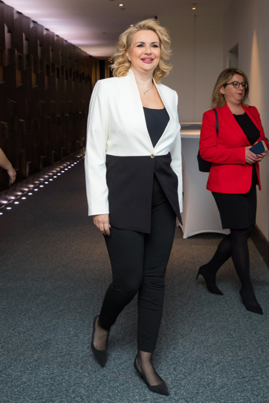 Ministarka za brigu o porodici i demografiju u Vladi Srbije za tu priliku odabrala je crno-belu kombinaciju, klasiku sa blagim dodirom modernih trendova. Crne uske pantalone, elegantne cipele i interesantan sako u dve boje.
