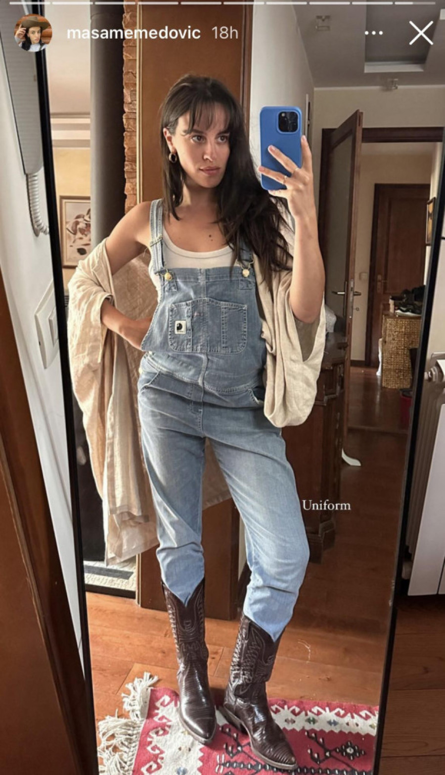 Lepotica je za svoju "uniformu" obukla treger-pantalone, i uklopila ih je sa kaubojskim čizmama. Nabacila je tanki laneni ogrtač zbog promenljivog vremena.