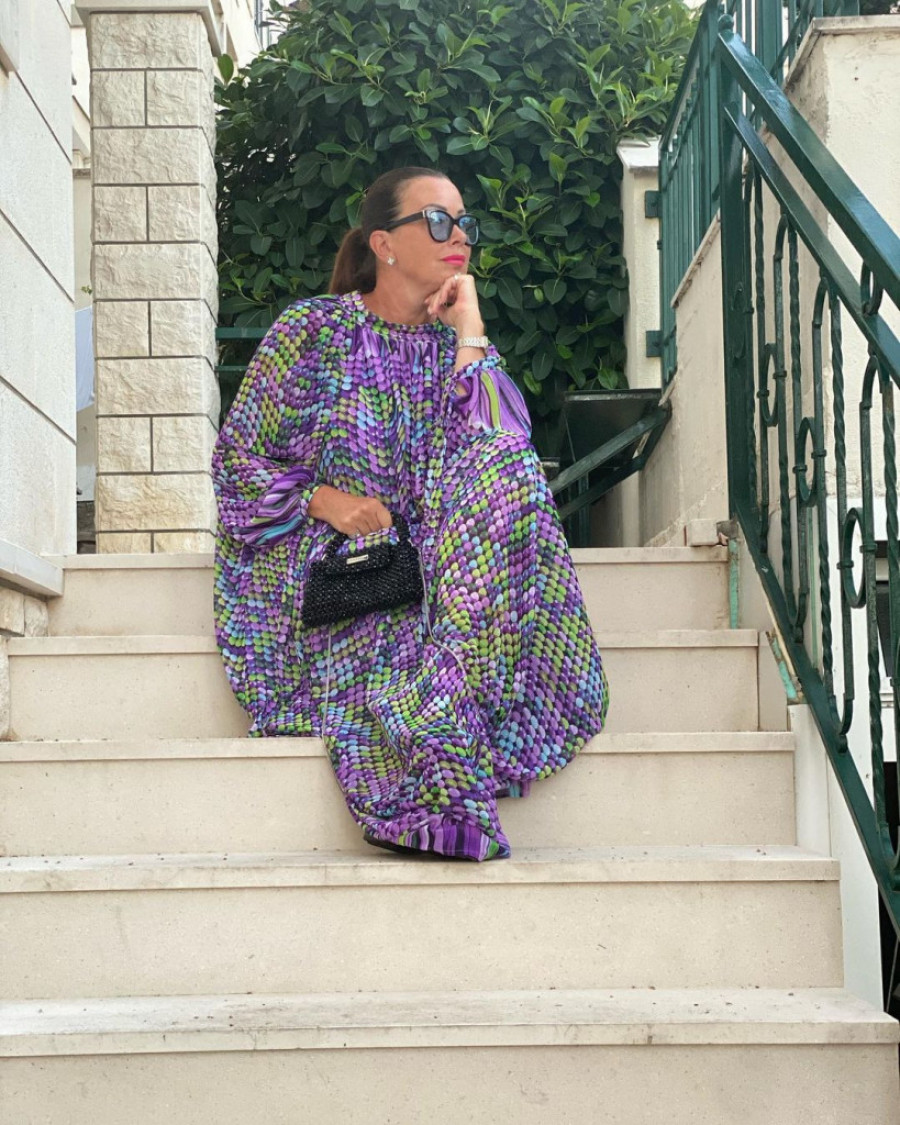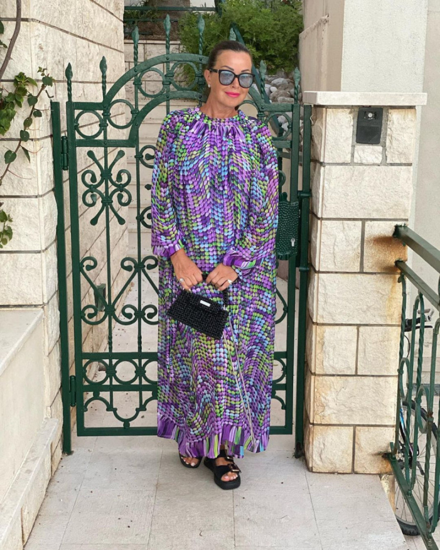 Tako je u jedan suton ušla sa neobičnom, prelepom dugom haljinom koja izgleda kao mozaik. Među tonovima koji se presijavaju na ovom originalnom modelu preovlađuju ljubičaste nijanse, savršeno se uklapajući u ambijent i boju sunca na zalasku. S obzirom na dimenzije i slobodan kroj koji ne ističe siluetu, lepa haljina Dragane Katić može uspešno da sakrije i višak kilograma, ukoliko postoji.