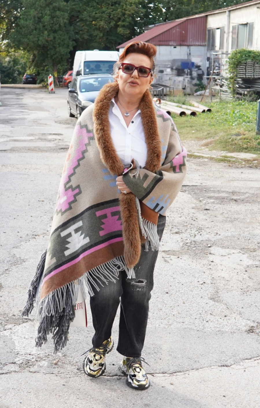 Ponedeljak je bio rezervisan za spoj nespojivog! Naime, slavna dama smelo je ušetala u studio, ni manje ni više, nego u šarenim sportskim patikama, iscepanim farmerkama i beloj košulji. Ceo stajling upotpunila je orginalnim pončom koji je na rubu imao krzno.