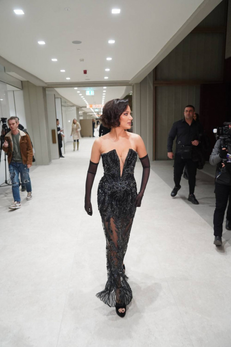 Ceca je takođe olučila da za svoj nastup obuče maxi haljinu, ali umesto potpuno monohromatskog look-a kakav je imala Prija, folk legenda je imala dijamantske detalje oko struka i dekoltea.