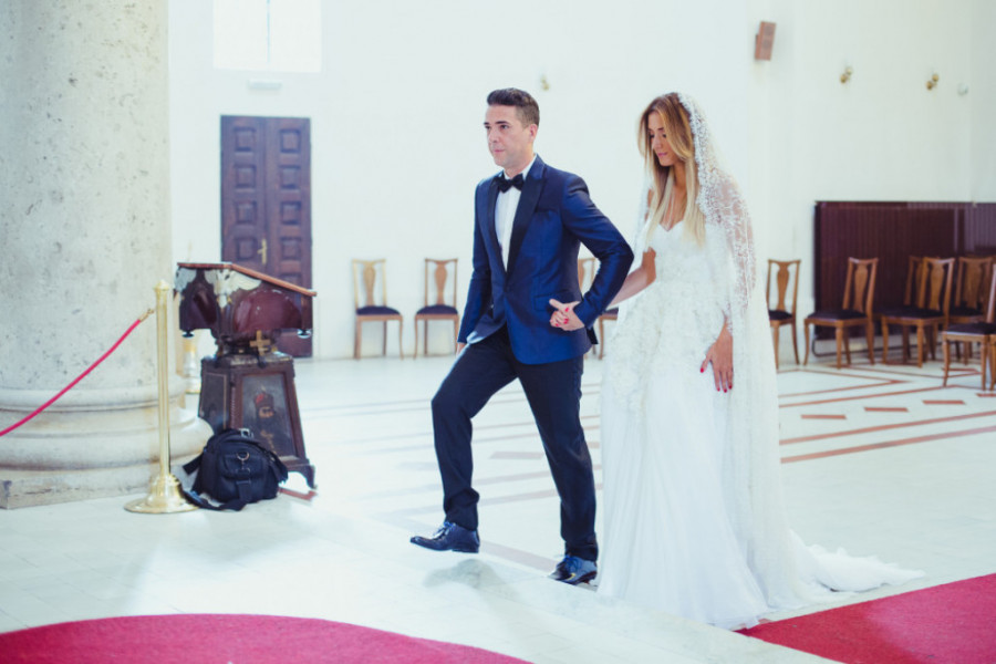 Za ceremoniju u crkvi Jovana je odbrala dugu belu venčanicu sa romantičnim aplikacijama, dugačkim velom i potpisom kreatora Darka Kostića.