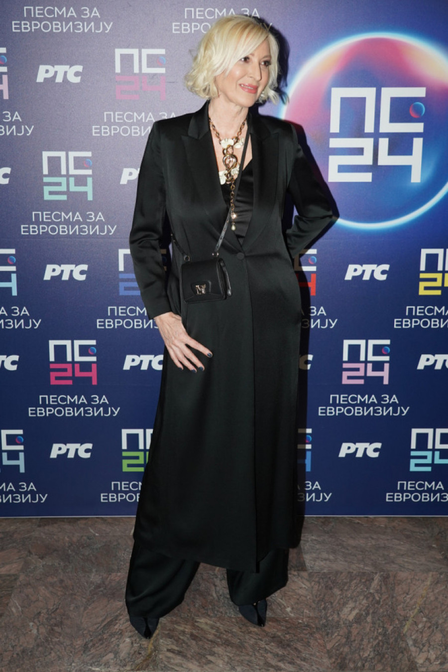 I Sandra je prednost dala crnoj boji. Sako sa romantičnim detaljem, pletenicom na jednom rukavu i brošem u obliku pahulje, ukomponovala je sa pantalonama na crno-srebrne šljokičaste pruge i trendi cipelama.