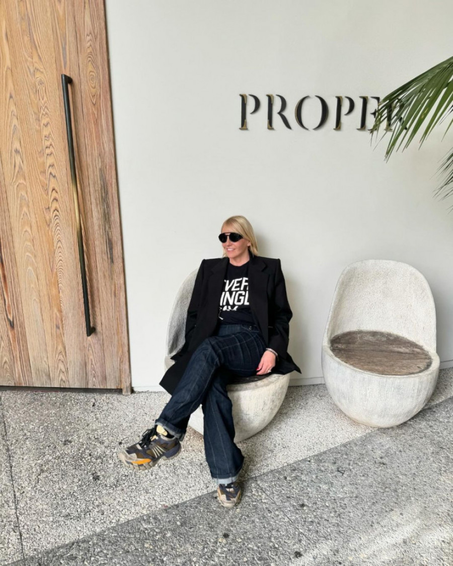 Mladalački izgled Ane Divac došao je u prvi plan kada je obukla farmerke i crnu majicu sa printom, uz koje je ponela crni sako i zanimljive patike. Modnu kombinaciju upotpunila je naočarima za sunce sa tamnim staklima.