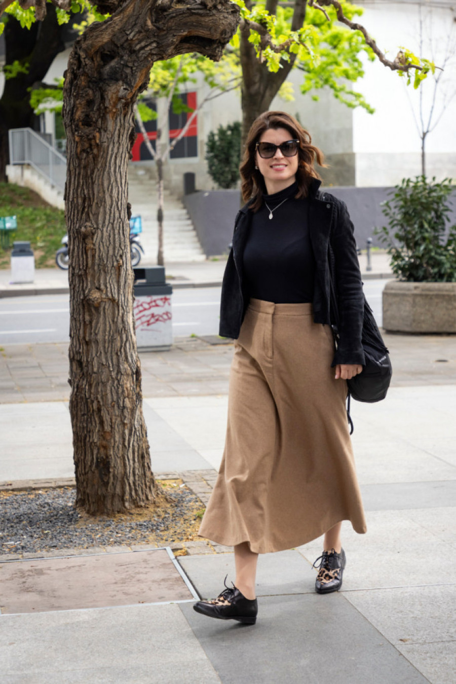 Crna majica i kratka jakna u istoj boji savršeno su se uklopili sa maksi suknjom u nijansi peska i ravnim cipelama sa leopard motivom.