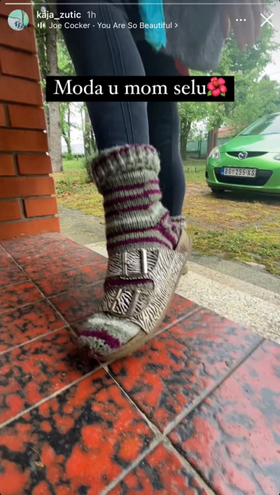 Kaja Žutić oduševila nas je seoskim izdanjem, ali, što je najvažnije – njoj je toplo! Na nogama ima pravi hit, od čiste vune, nazvaćemo ga “made in Barajevo”. Debele pletene čarape interesantnog dizajna.