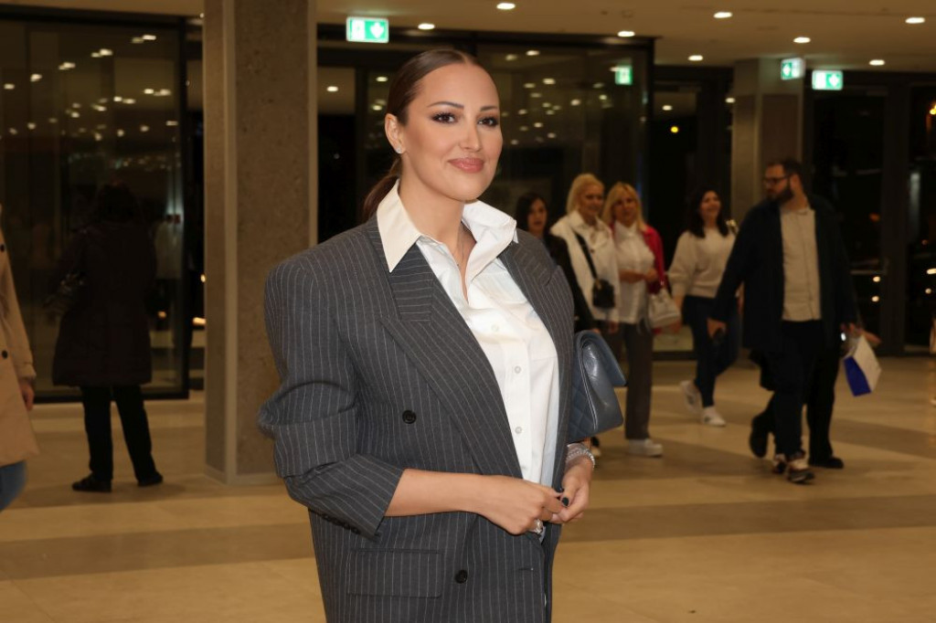 Za koncert Marije Šerifović izabrala je kežual varijantu: crne pantalone, belu košulju i sivi sako.