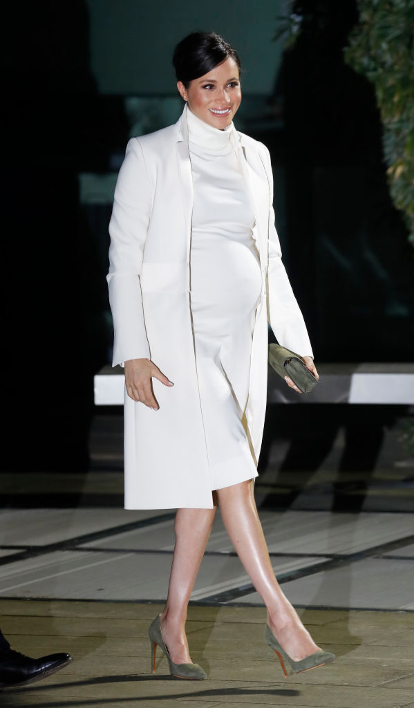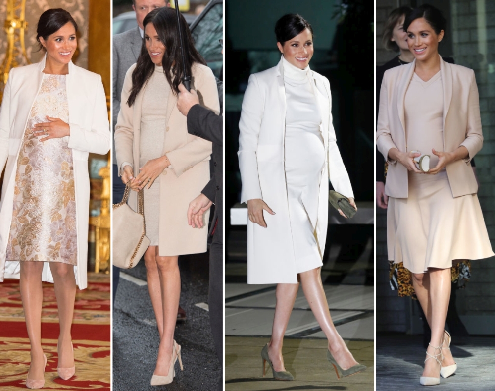 Sesil Rino, osnivačica brenda Seraphine, inače omiljenog brenda trudničke odeće Kejt Midlton, ranije je za Instyle objasnila kako je vojvotkinja od Saseksa žena sitnije telesne građe te zbog toga njezin trudnički stomačić dolazi do izražaja što god obuče, čineći je krupnijom. Da bi to izbegla, Megan strateški bira mini haljine koje pažnju s stomaka preusmeravaju na noge.