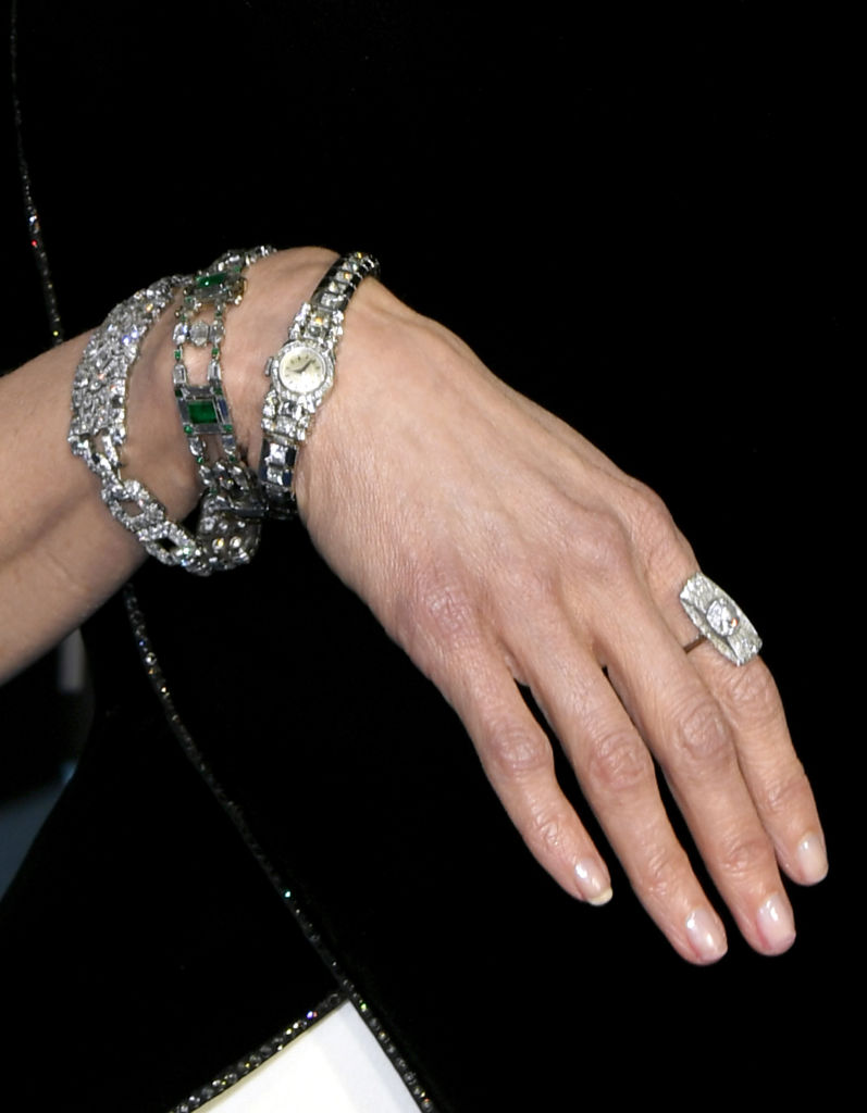 Za razliku od Džulije, Nikol ne voli neobične lakove na noktima, te se odlučila za frenč manikir, ali je zato nakit s dijamantima i smaragdima upotpunio kombinaciju, kao i efektna torbica.