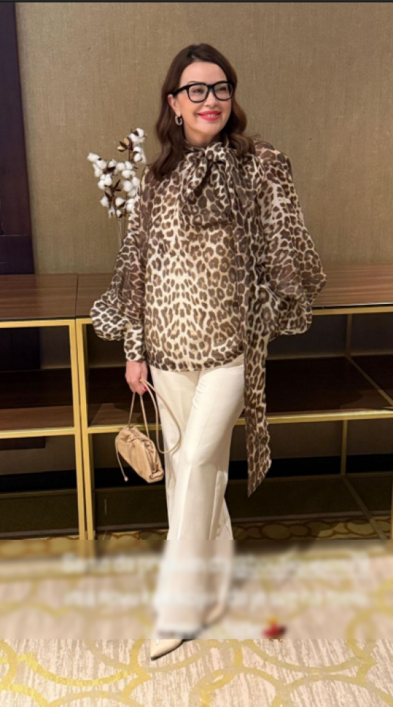 I ovde, ona zrači samopouzdanjem i elegancijom, noseći upečatljiv leopard dezen uz čistu siluetu klasičnih belih pantalona. Kombinacija nonšalantnog glamura i otmenosti, bez preterivanja i bez trčanja za trendovima.