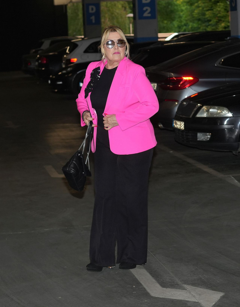 Pink sako Snežane Đurišić sa strukturiranim ramenima naglašava gornji deo tela, dok crna bluza i široke pantalone iste boje suptilno prikrivaju odstupanja u predelu struka i nogu.