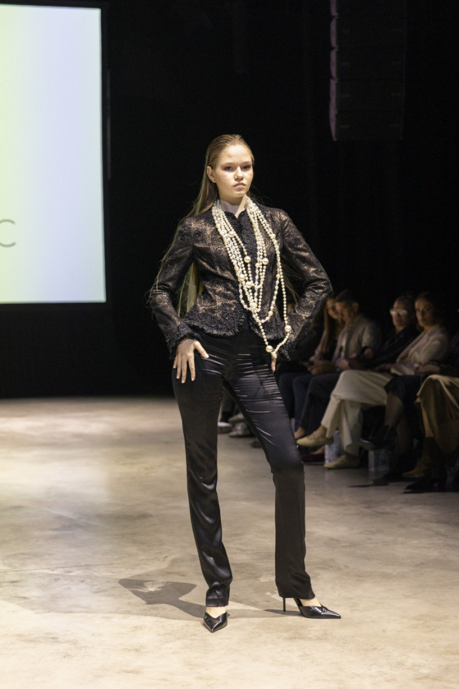 Segment mladih autora doneo je koncentrisan, savremen izraz sa fokusom na jasnoj konstrukciji i ideji. U brzim, čistim kadrovima smenjivali su se monohrom (crno/belo) sa akcentima kobalta, crvene i metalik srebra, kombinacije strukiranih blejzera i uskih suknji, mini slip-haljina, korzetiranih topova i fluidnih midi formi. Teksture su odigrale ključnu ulogu - vuna i tvil naspram satena i tila, uz kožne umetke i diskretne sjajne površine - dok su asimetrični rezovi, geometrijski prorezi i slojevito stilizovanje preko košulja i tankih rolki naglasili liniju i siluetu. Stilizacija je bila minimalistička, uz obuću od špic salonki do čizama do kolena. Rezultat su moderni, smelo promišljeni komadi koji pomeraju formu do prave mere, a ostaju funkcionalni, jasno otelotvorena ambicija nove generacije, što je publika ispratila oduševljenim aplauzom.