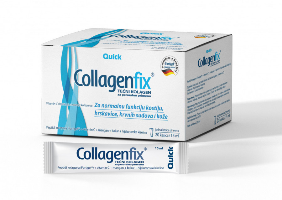 Collagenfix® je tečni kolagen za peroralnu primenu i sadrži Fortigel®, bioaktivne peptide kolagena u dozi od čak 5.000 mg, koji se brzo i lako apsorbuju. Collagenfix®, pored bioaktivnih peptida (Fortigel®), sadrži i hijaluronsku kiselinu, vitamin C, mangan i bakar koji zajedno, klinički dokazano, ostvaruju poboljšanje pokretljivosti zglobova i pospešuju njihovu regeneraciju. Takođe, koži i kosi pružaju kvalitetnu negu i zdrav i lep izgled.