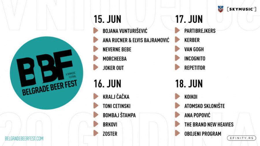 Najveća regionalna manifestacija posvećena muzici i pivu, Belgrade Beer Fest u organizaciji Skymusic-a, u svom jubilarnom 20. izdanju, otvoriće svoje kapije ranije nego prethodnih godina, i to 15. juna, a tokom četiri dana (do 18. juna) posetioce očekuje više od 60 izvođača na čak tri bine – Main stage, Riff stage i Electro stage powered by Sakura.