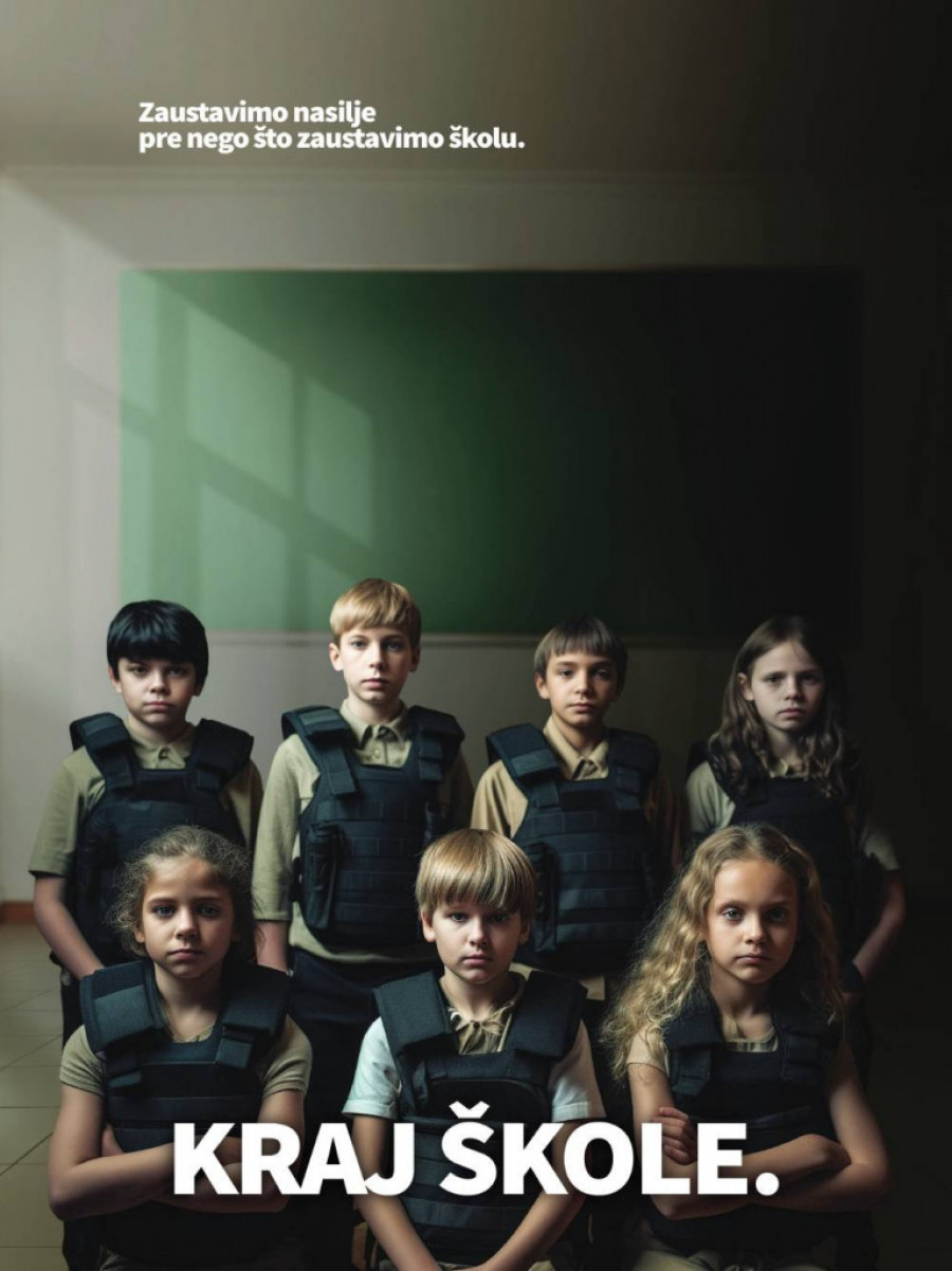 Rad Kraj škole, kreiran uz pomoć veštačke inteligencije sa nepostojećim likovima, predstavljao je reakciju na tragični događaj u beogradskoj osnovnoj školi maja ove godine i objavljen je na naslovnoj strani magazina Nedeljnik.