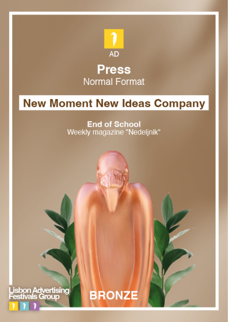 Agencija New Moment New Ideas Company osvojila je bronzanu nagradu u kategoriji PRINT na Internacionalnom festivalu kreativnosti “Lisabon Advertising Festival” za rad Kraj škole. To je ujedno i jedini nagrađeni rad u kategoriji Print na ovogodišnjem festivalu.