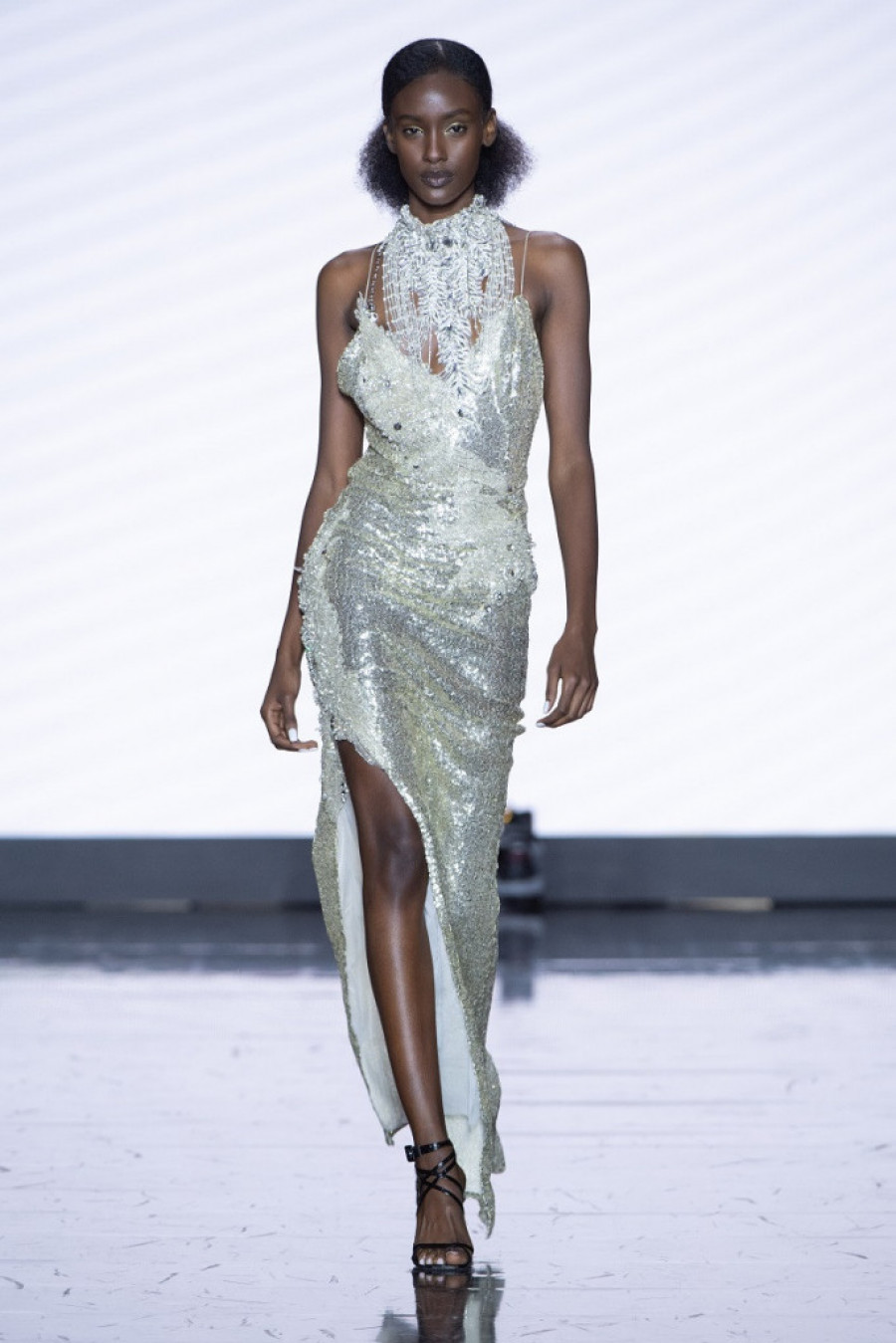 Suzana Perić kolekcijom Glam Galaxy predstavlja haljine od svile i brokata, smelih krojeva, obogaćene detaljima ručne izrade. Poigrava se klasikom dovodeći je u kontekst popularnog futurizma.