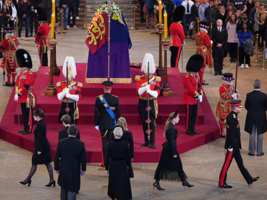 Preksinoć je u Vestminster holu održano bdenje pred odrom kraljice Elizabete, na kome su bili njenih osmoro unučadi na čelu sa prinčevima Vilijamom i Harijem.