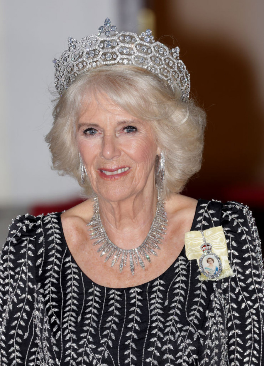 Kasnije tokom večeri Kamila je ponela još jedan komad iz kraljičine bogate kolekcije ‒ dijamantsku tijaru kuće „Bušeren“ u kombinaciji sa prikladnom ogrlicom. Eksperti navode da je predivno videti deo britanske istorije na zvaničnim događajima.