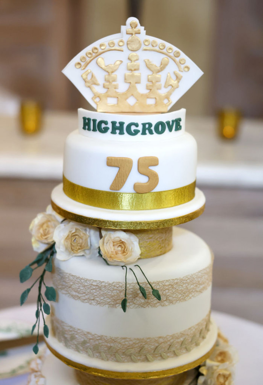U pitanju je Viktorijin biskvit, sa zlatnom glazurom i krunom. Torta na tri sprata imala je ukrase od bledožutih ruža, a na samom vrhu, ispod krune, ispisan je broj „75“.
