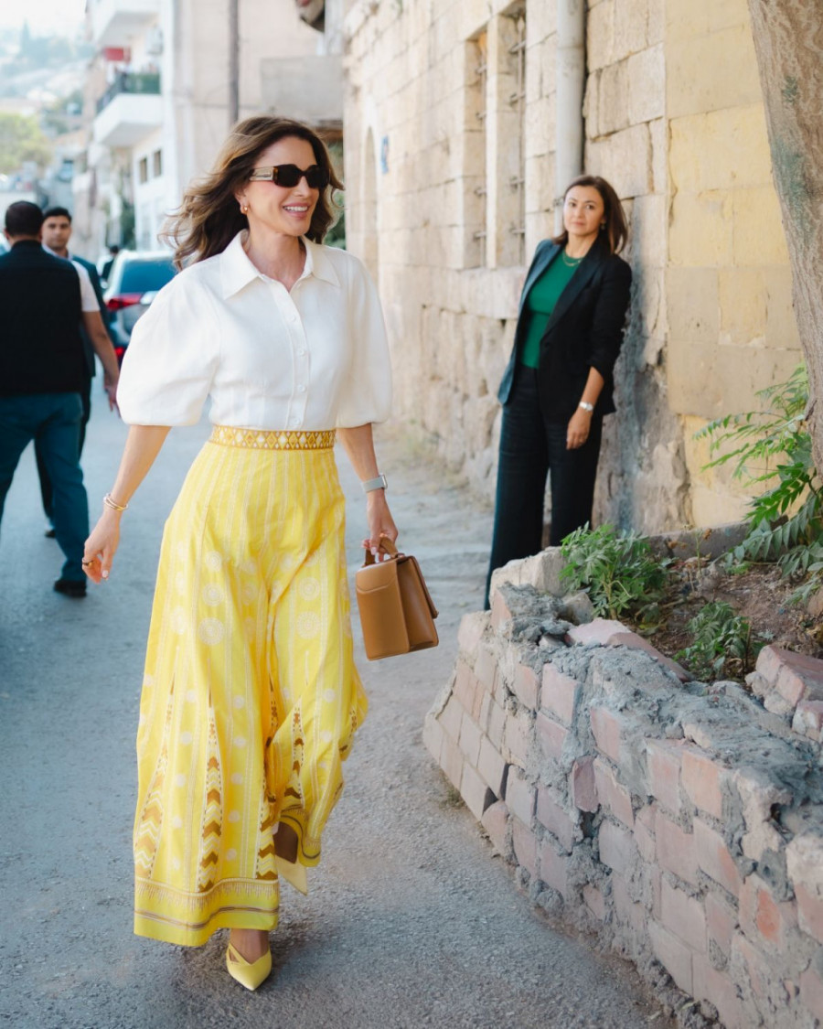 Kraljica Ranija još jednom je pokazala besprekoran modni stil. Odevnu kombinaciju, kao stvorenu za modni izlazak, činila je bela bluza sa “puf” rukavima, modne kuće Chloe, duga žuta suknja A-kroja sa vezom, i žute salonke sa potpisom Prada.
