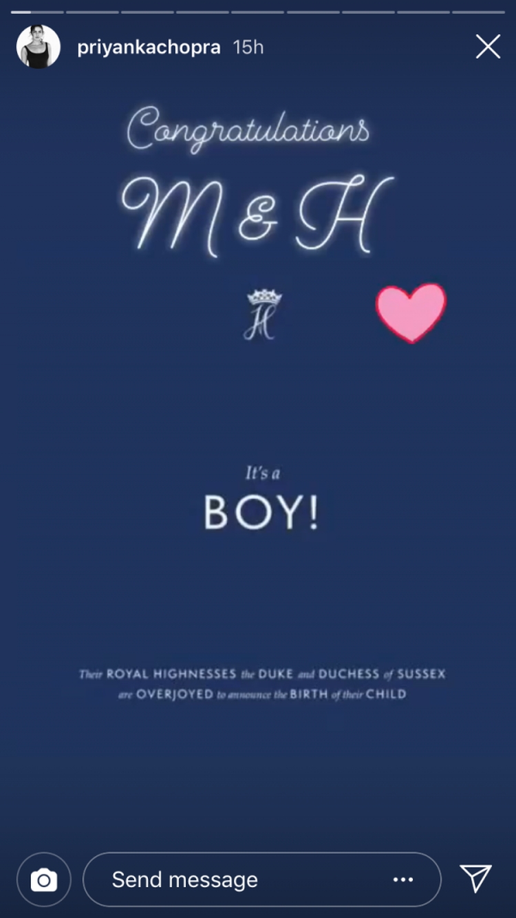 Tako je bliska prijateljica Megan Markl, ujedno jedna od najlepših žena sveta Prijanka Čopra, samo nekoliko sati pre negoli se uputila na crveni tepih Met Gale, objavila na svom Instagram Storiju screenshot objave sa službenog Instagram profila Megan Markl i princa Harija, na kojoj je pisalo: 'Rodio se dečak!'. Ona je tek dodala: 'Čestitam M & H'.