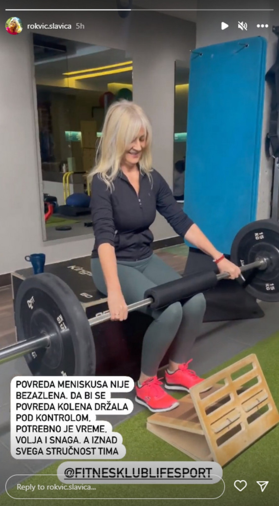 Slavica je imala manju povredu kolena, a kako bi je držala pod kontrolom preporučeni su joj treninzi. Osmeh na lice, tegove u ruke, i kako Slavica kaže “potrebno je vreme, volja i snaga”.