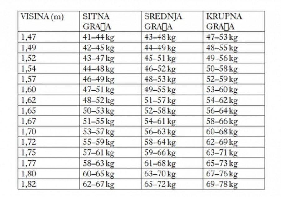 Zato u tabeli pronađite svoju idealnu težinu koju smo izračunali u odnosu na građu i visinu.