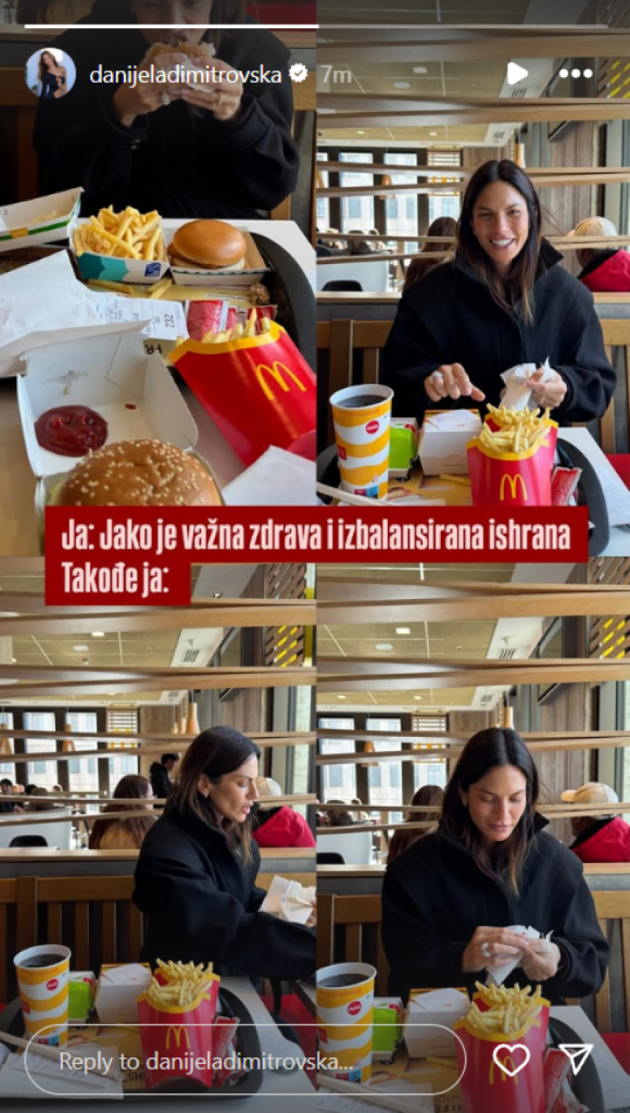 Situacije u kojima izgubi kontolu vrlo su retke, zbog čega je sve iznenadilo kada je nedavno uslikana sa sočnim burgerom i pomfritom. U opisu fotografije bivša manekenka, danas voditeljka i vlasnica modne agencije, napisala je da ona želi da jede uvek izbalansirano ali da je i ona čovek od krvi i mesa koja ume da pogreši.