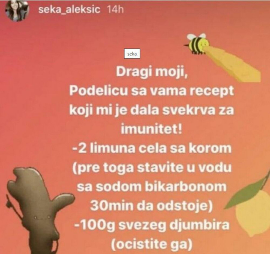 Seka Aleksić i njen suprug Veljko često dele sa svojim pratiocima na Instagramu kako vode računa o ishrani i zdravom životu. Pevačica je podelila i recept za moćan imunitet koji je dobila od tačnije Veljkove majke.