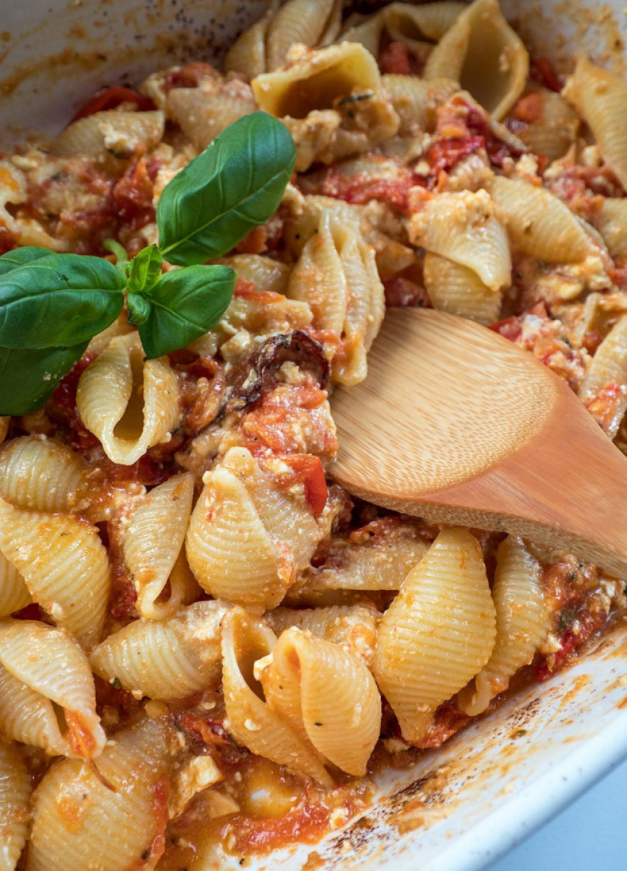 Izvadite pleh iz rerne, izdrobite fetu viljuškom i mešajte sa paradajzom dok ne dobijete kremastu smesu, kao sos. U nju potom umešajte testenine, a ako volite, ukrasite odozgo preostalim origanom i bosiljkom.