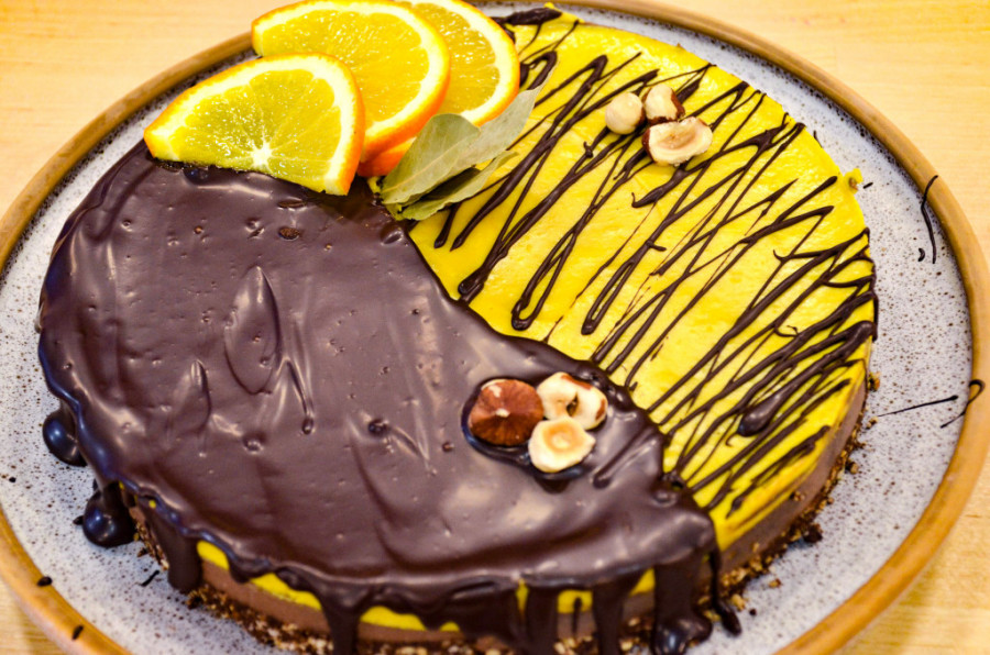 Sastojke za čokoladni fil stavite u blender i izmiksujte, pa prelijte preko kore. Isto uradite i sa sastojcima za fil od pomorandže, koji ćete potom preliti preko čokoladnog fila.