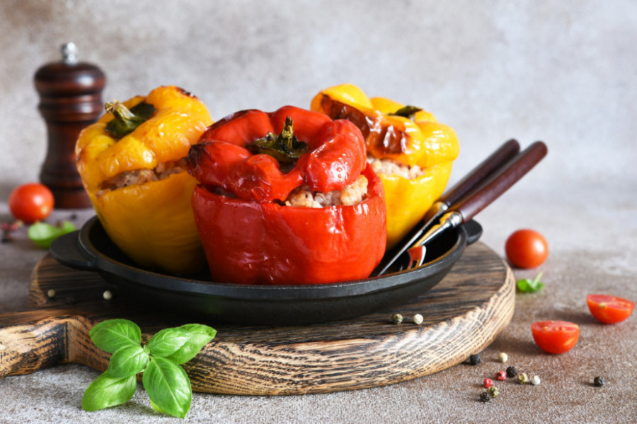 Za ovo ukusno jelo potrebno je 8 paprika, 500 g pšenice, 3 čena belog luka,100 g paradajza, 300 g praziluka, pola kašičice slatke paprike i bosiljak.