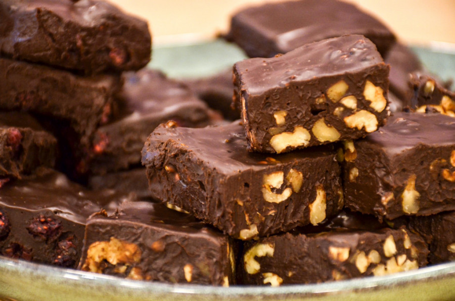 Kondenzovano mleko i čokoladu otopite na pari, te dodajte aromu vanile. Smesu podelite u tri dela. U jedan dodajte seckane orahe, u drugi dehidrirane maline, a treći ostavite kakav jeste. Svaku smesu izlijte u poseban mali pleh obložen papirom za pečenje i hladite u frižideru bar četiri sata, najbolje preko noći. Isecite na manje kocke.
