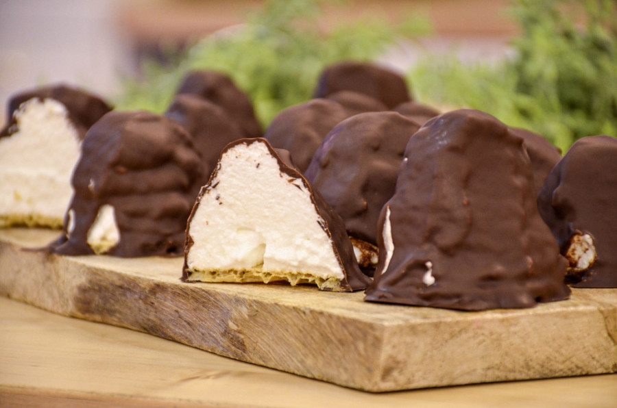 Manjom okruglom modlom vadite krugove iz oblande. Belanca i šećer mutite na pari da dobijete gust šam, koji ćete staviti u dresir-kesu. Na krugove oblandi istisnite smesu u kupu. Čokoladu otopite na pari sa kokosovim uljem i prelijte preko šama. Ohladite pre služenja.