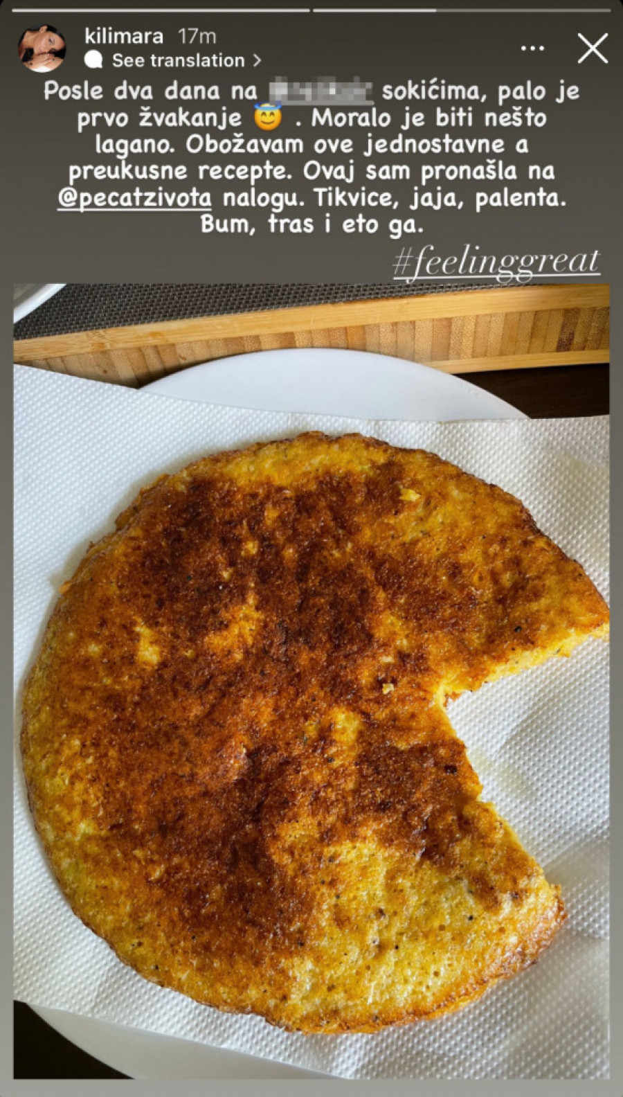 „Posle dva dana na sokićima, palo je prvo žvakanje. Moralo je biti nešto lagano. Obožavam jednostavne, a preukusne recepte. Ovaj sam pronašla na @pecatzivota nalogu. Tikvice, jaja, palenta. Bum, tras, i eto ga!“