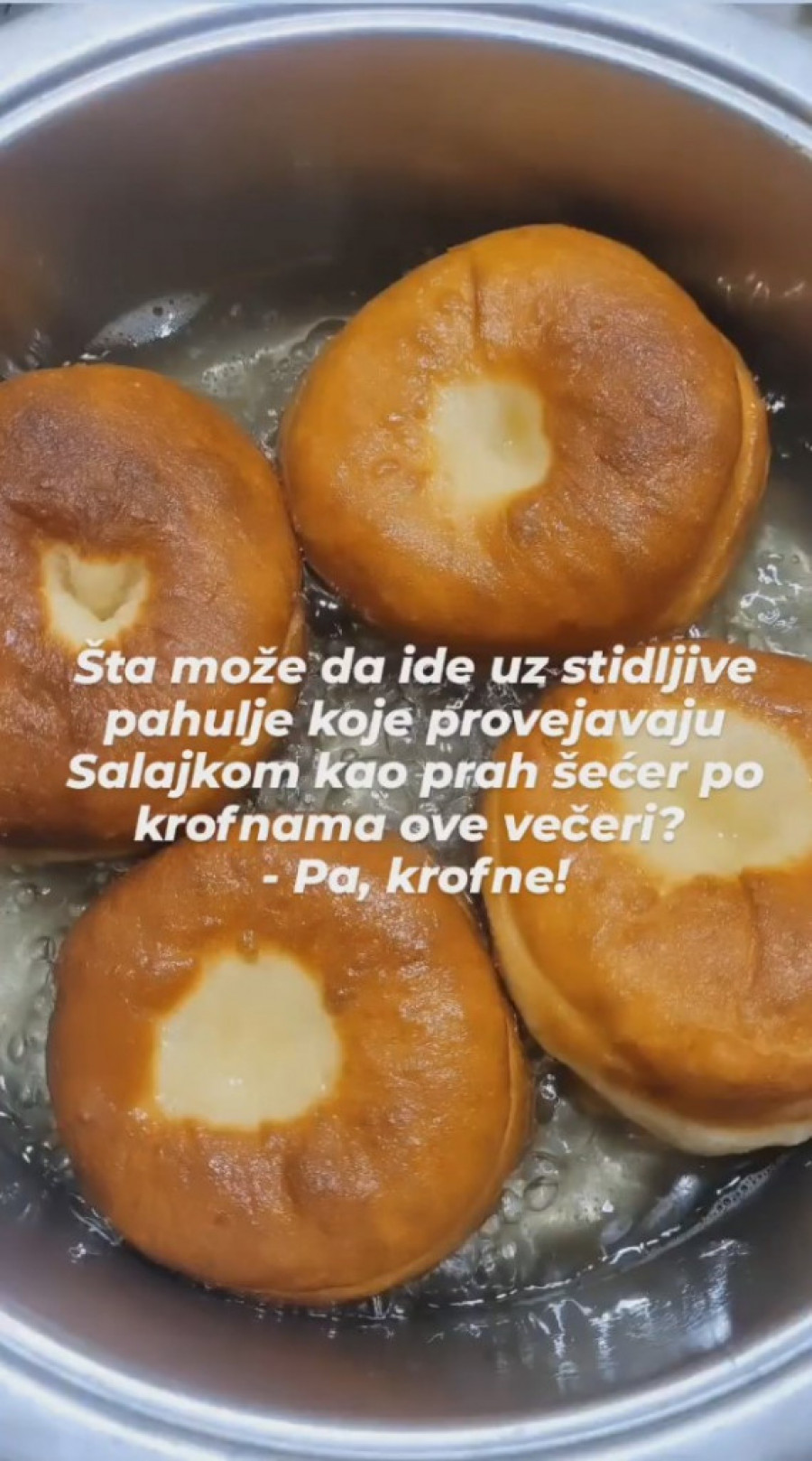 “Šta može da ide uz stidljive pahulje koje provejavaju Salajkom kao prah šećer po krofnama ove večeri? Pa, krofne!”, napisala je na Instagramu supruga Panonskog mornara, prilažući „dokaz“ iz kuhinje.
